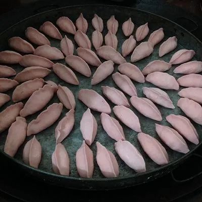 重點(diǎn)說說我愛吃的芋頭餃吧,把它含在嘴里時(shí)滑溜溜的,如同泥鰍。選用粉粉軟糯、有粘性的芋頭,和番薯粉一起揉成面團(tuán),然后再包肉餡。煮好的芋餃吃起來既糯又柔,滑溜可口。