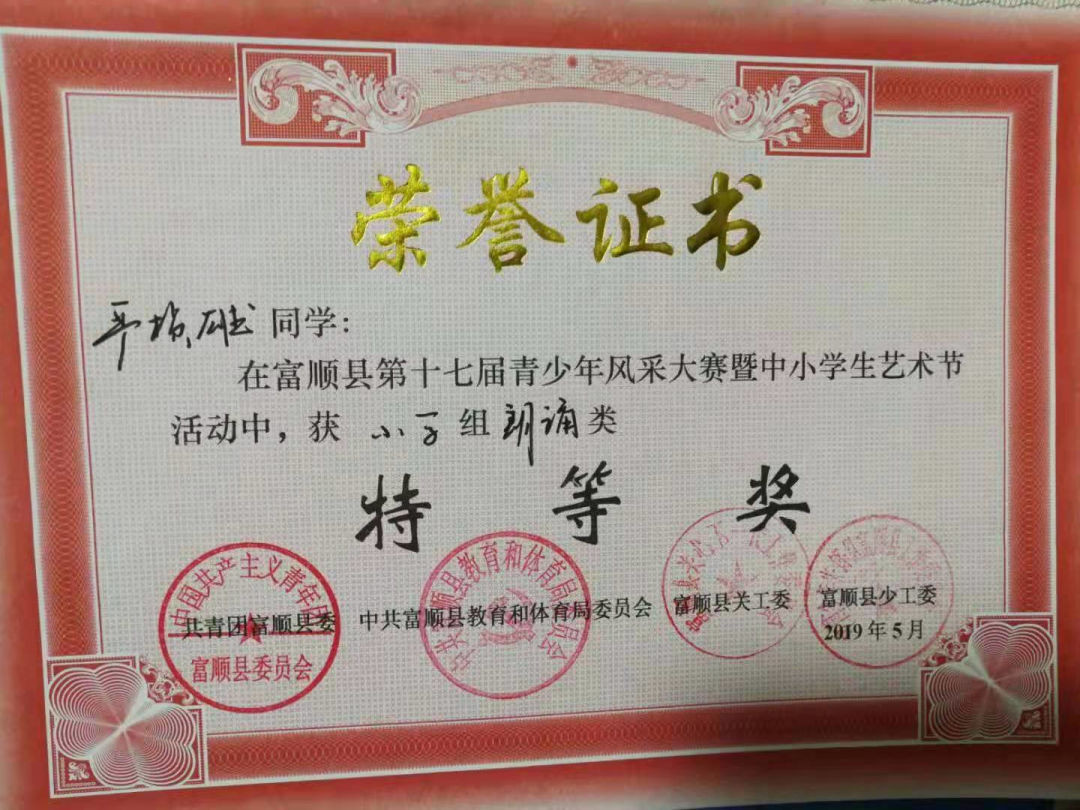 獲得縣青少年風(fēng)采大賽暨中小學(xué)生藝術(shù)節(jié)朗讀特等獎(jiǎng)。