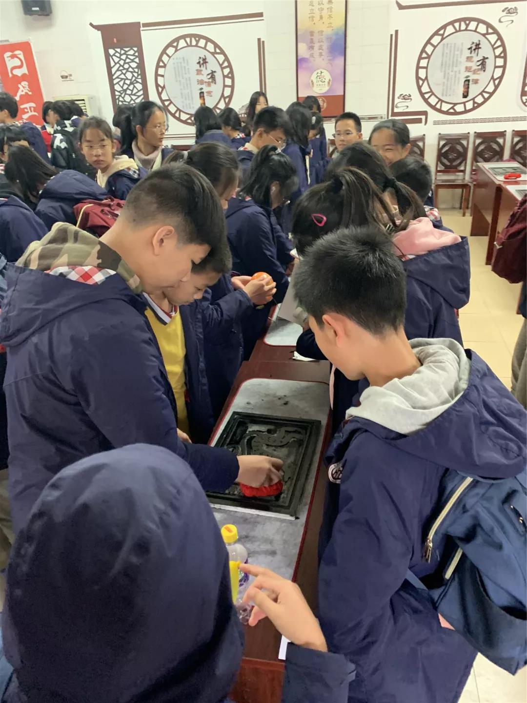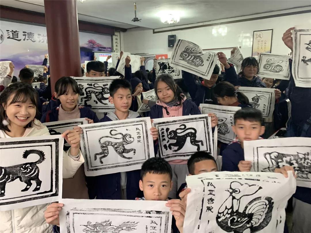 再看看,生肖拓印現(xiàn)場的同學們也非常認真。在講解員的精心講解后,同學們用小盆中的刷子蘸取墨汁在拓板上從上到下的刷。最后用宣紙覆蓋在上面,再用小的紅色物品輕輕的按壓,形成成品??粗粡垙堄H手拓印的生肖畫,同學們可開心了!據(jù)說, 還有同學專門為自己父母拓印了生肖圖呢!