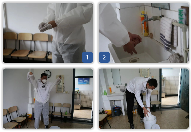 安全應急處置和引領負責人趙老師按照規(guī)定和程序脫掉和處理防護用品。