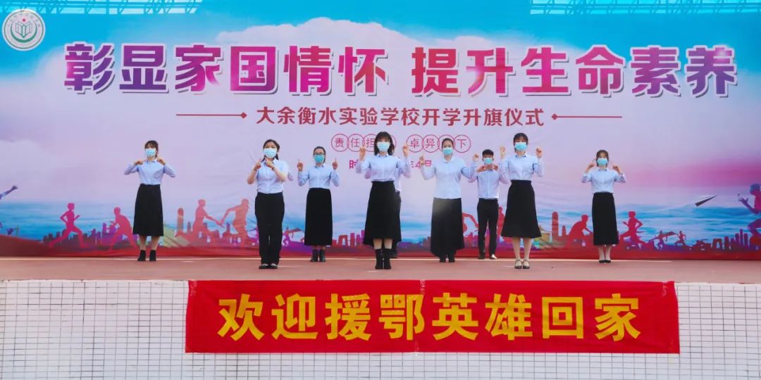 2020年4月9日,大余衡水實驗學(xué)校舉行了復(fù)學(xué)的第一次升旗儀式,全體教職員工相聚學(xué)校田徑場,1600余名學(xué)生在線同步觀看直播,以隔空參與的形式共同見證了這充滿紀(jì)念意義的升旗儀式?,F(xiàn)場邀請了大余縣衛(wèi)健委謝芳華副主任以及大余縣人民醫(yī)院腫瘤科王啟平主治醫(yī)師、內(nèi)三科彭聯(lián)平主治醫(yī)師、中醫(yī)院王穎娟護(hù)士三位抗疫英雄代表參加此次儀式。