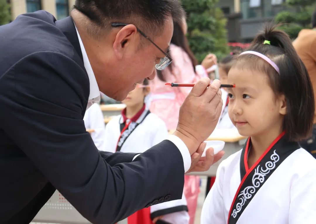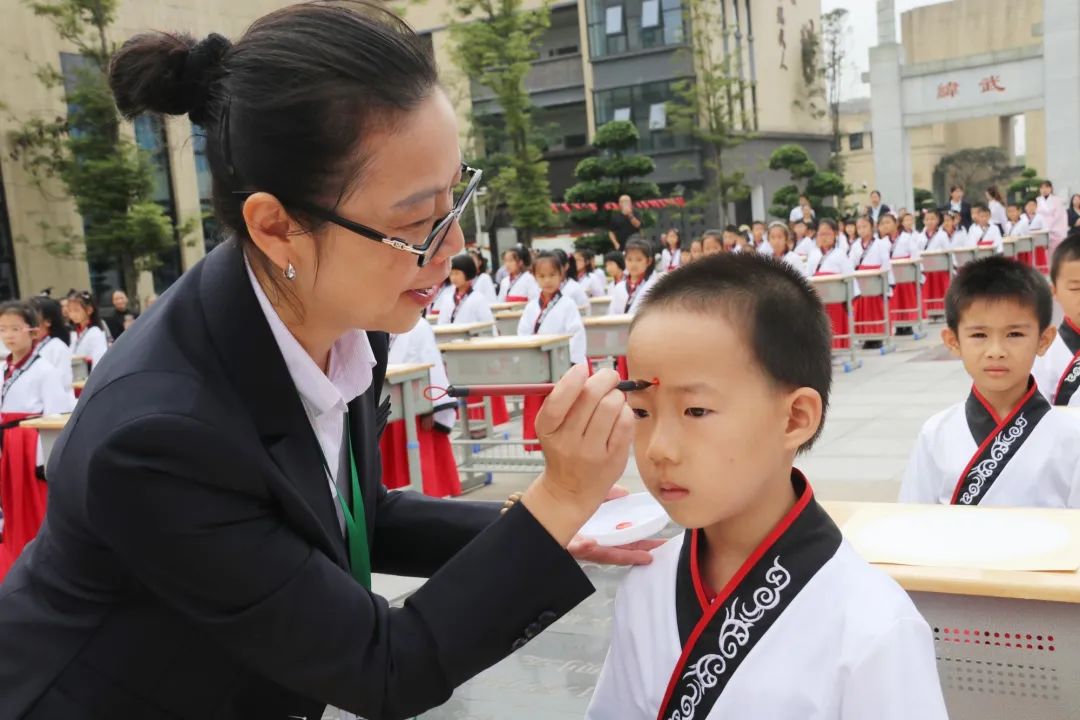 第二項(xiàng)由尹校長、徐校長帶領(lǐng)老師們給孩子們“啟智” ,一起將鮮紅的朱砂,在孩子們的額頭正中點(diǎn)痣,為他們開天眼。一顆顆紅痣在額上閃耀,飽含父母、長輩、學(xué)校的美好祝愿,在孩了們心中勾畫起一道道亮麗的風(fēng)景。
