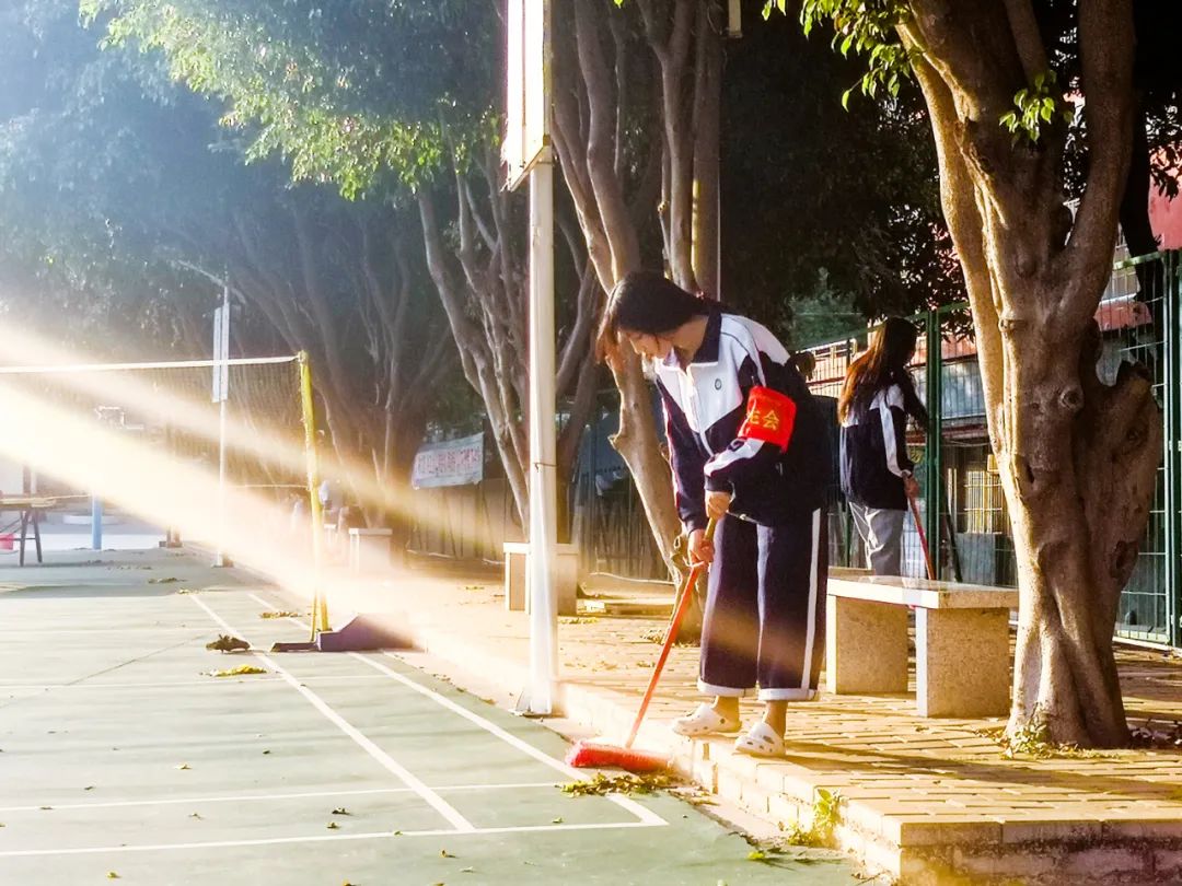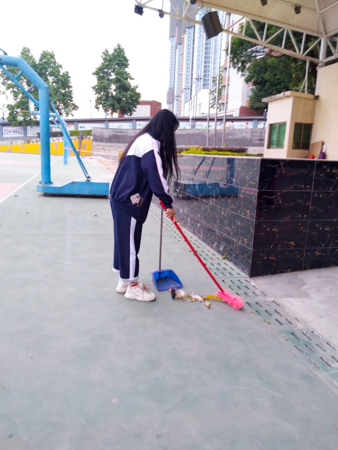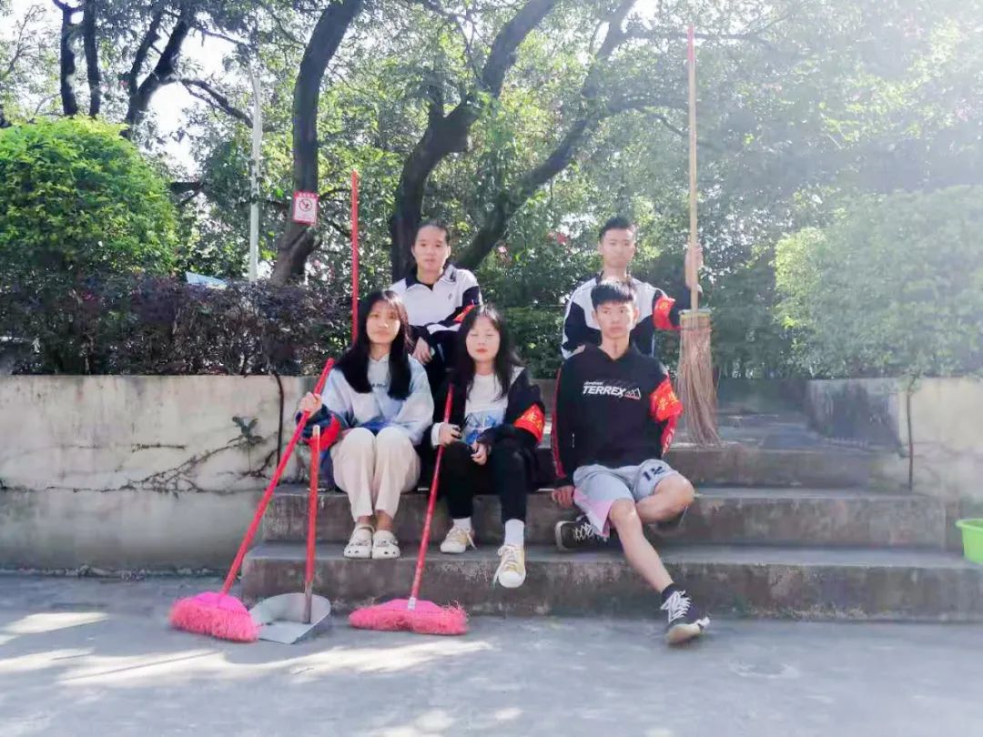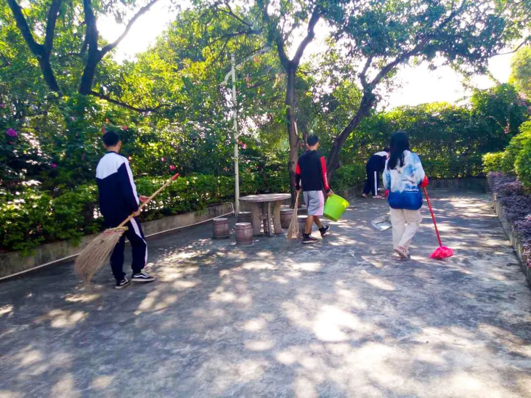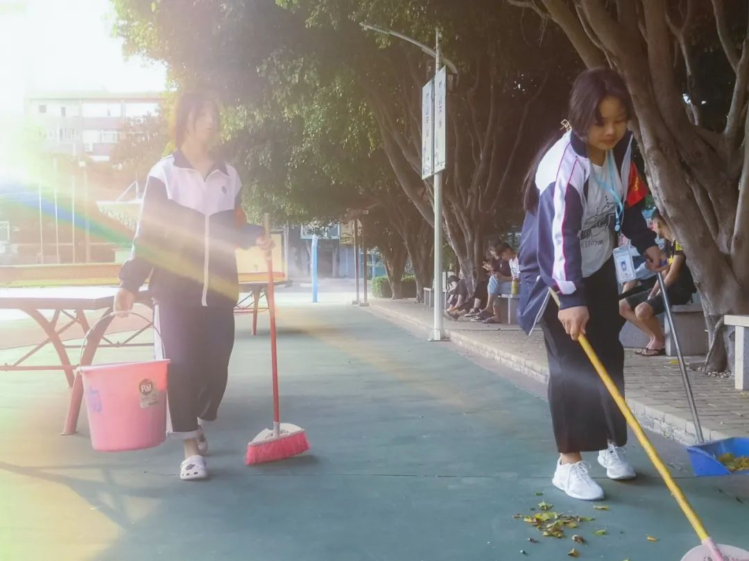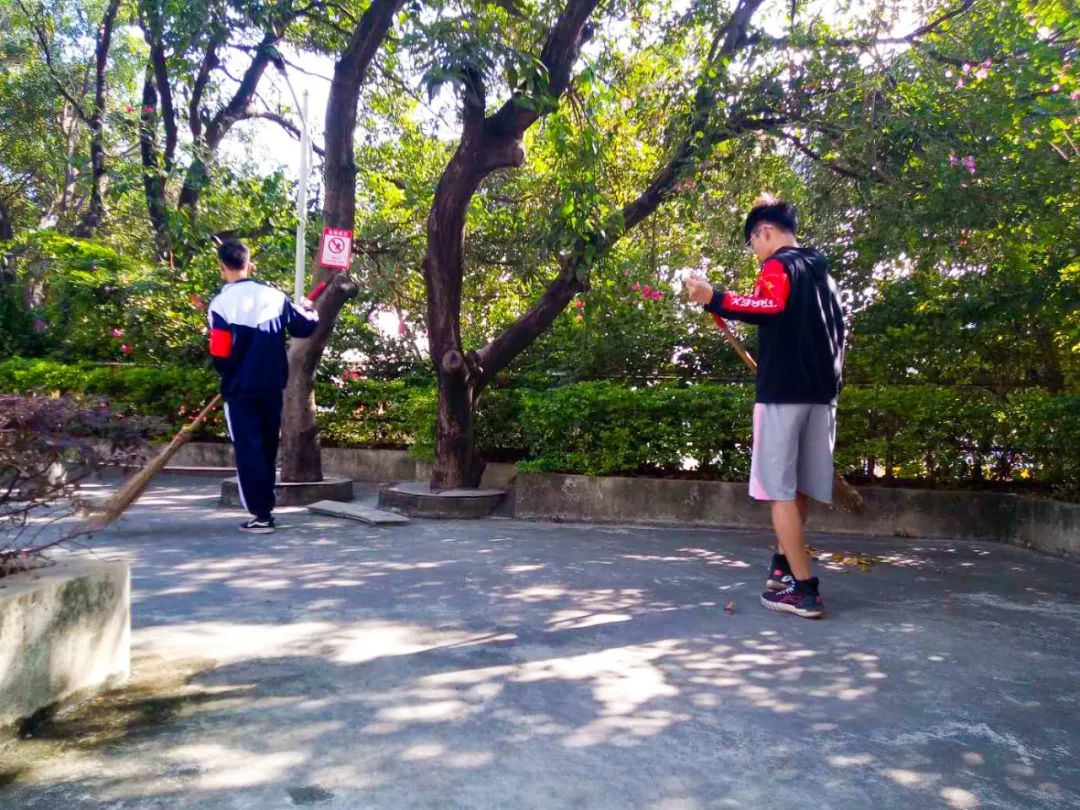 提前到達(dá)操場的是王廷榮、黃詩文、李仁懷、李燦彬、溫善媛等同學(xué)。他們揮動著掃把便開始“沙沙”地清掃落葉,掃地的聲音好像鳥兒在對他們唱歌,又像是在鼓勵他們:“勞動的孩子最美麗”。
