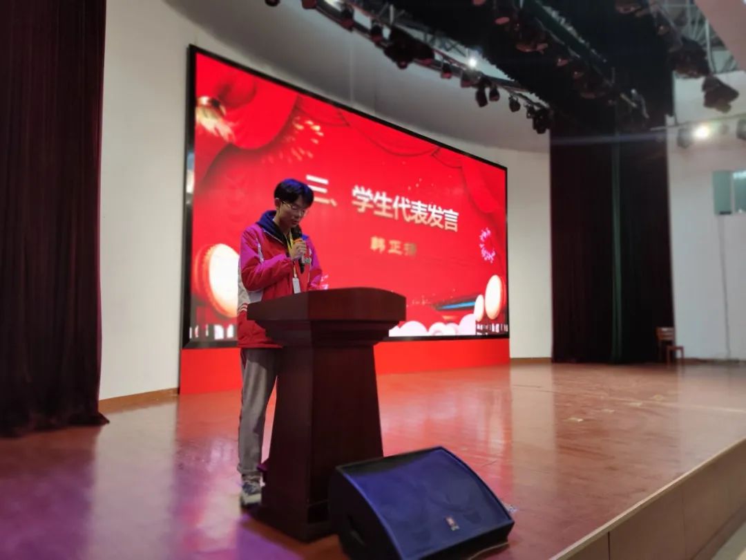 表彰之后,學(xué)生代表韓正揚(yáng)同學(xué)進(jìn)行了發(fā)言,他以自身不懈奮斗取得優(yōu)異成績的經(jīng)歷,勉勵各位同學(xué),告訴大家“既然選擇了遠(yuǎn)方,便只顧風(fēng)雨兼程”,未來是屬于努力的人的。